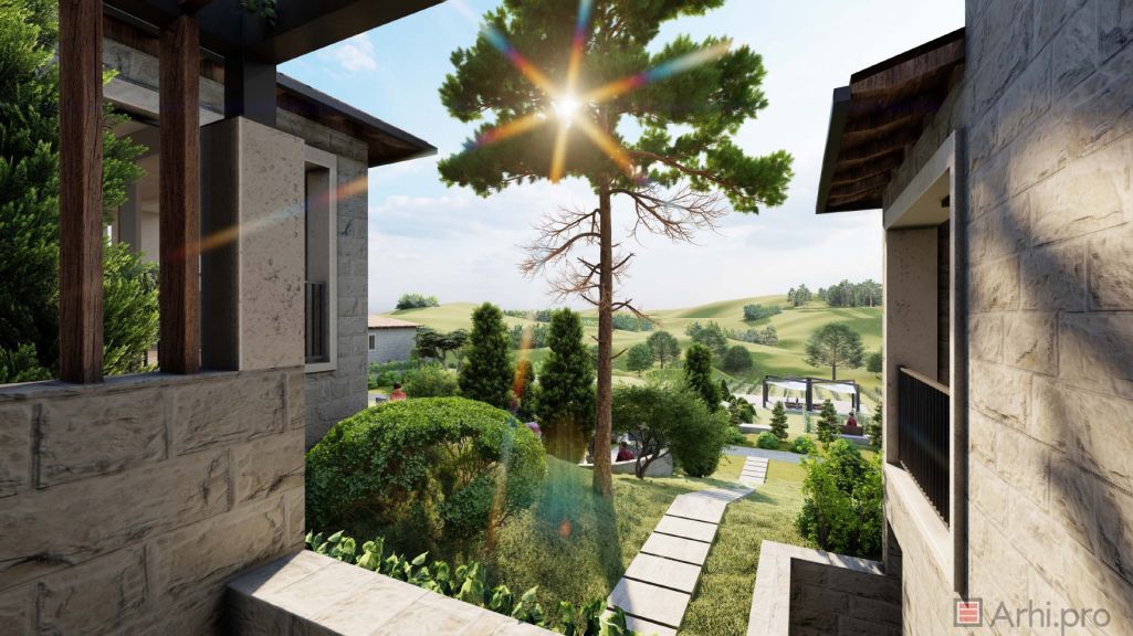 Objekti su zamišljeni kao moderne vile sa kamenim oblogama, velikim otvorima i kosim krovovima, dok je u svakom bungalovu planiran i vinski podrum.